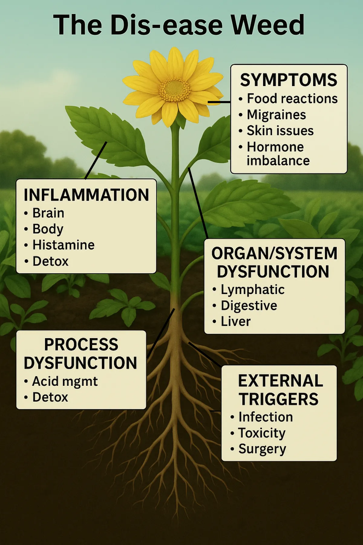 Most approaches to healing only deal with the leaves — the obvious symptoms. Medications trim them back, supplements may soothe them, but the weed keeps growing. That’s why so many people feel temporary relief only to see their problems return or new ones emerge.